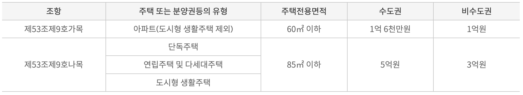 - 면적 요건: 주거전용면적 60㎡ 이하 또는 85㎡ 이하.