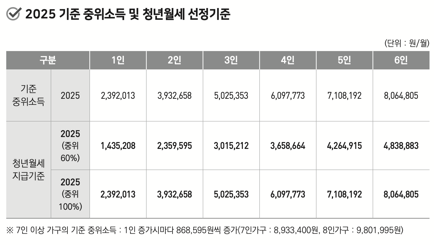 - 청년가구: 기준 중위소득 60% 이하.